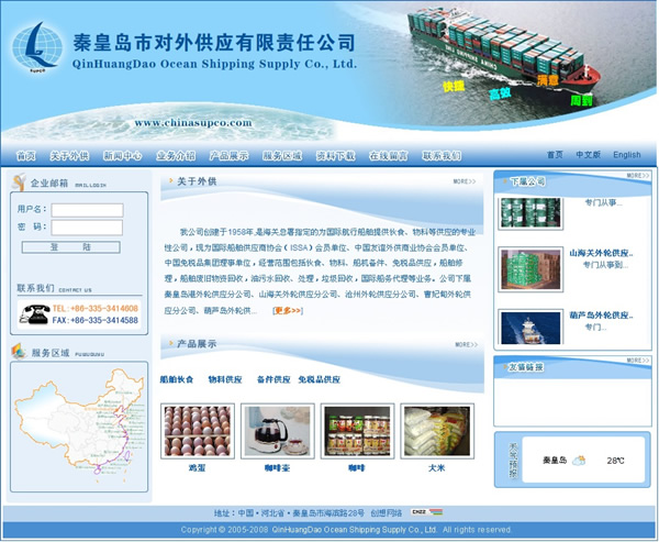 我公司創建于1958年,是海關總署指定的為國際航行船舶提供伙食、物料等供應的專業性公司,現為國際船舶供應商協會(ISSA)會員單位、中國友誼外供商業協會會員單位、中國免稅品集團理事單位,經營范圍包括伙食、物料、船機備件、免稅品供應,船舶修理,船舶廢舊物資回收,油污水回收、處理,垃圾回收,國際船務代理等業務。公司下屬秦皇島港外輪供應分公司、山海關外輪供應分公司、滄州外輪供應分公司、曹妃甸外輪供應分公司、葫蘆島外輪供應分公司、船舶服務分公司、船舶工程分公司、中免(秦皇島)公司、金士威國際船務代理等分公司或子公司,總資產4000多萬元。