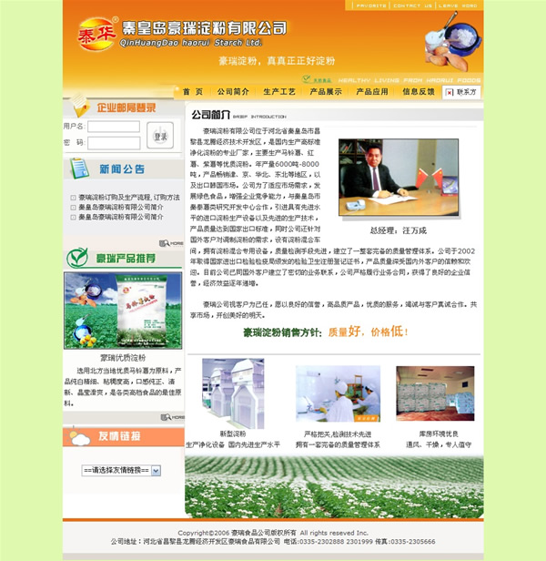 豪瑞淀粉有限公司位于河北省秦皇島市昌黎縣龍騰經濟技術開發(fā)區(qū),是國內生產高標準凈化淀粉的專業(yè)廠家,主要生產馬鈴薯、紅薯、紫薯等優(yōu)質淀粉。年產量6000噸-8000噸,產品暢銷津、京、華北、東北等地區(qū),以及出口韓國市場。公司為了適應市場需求,發(fā)展綠色食品,增強企業(yè)競爭能力,與秦皇島市秦泰薯類研究開發(fā)中心合作,引進具有先進水平的進口淀粉生產設備以及先進的生產技術,產品質量達到國家出口標準,同時公司還針對國外客戶對調制淀粉的需求,設有淀粉混合車間,擁有淀粉混合專用設備,質量檢測手段先進,建立了一整套完備的質量管理體系。公司于2002年取得國家進出口檢驗檢疫局頒發(fā)的檢驗衛(wèi)生注冊登記證書,產品質量深受國內外客戶的信賴和歡迎。目前公司已同國外客戶建立了密切的業(yè)務聯(lián)系,公司嚴格履行業(yè)務合同,獲得了良好的企業(yè)信譽,經濟效益逐年遞增。