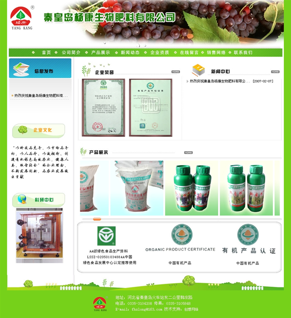 秦皇島楊康生物肥料有限公司坐落于全國著名的旅游海濱城市--------秦皇島.公司始建于1998年,引進了美國新菌種技術,結合我國的農業生產實際,生產微生物葉面肥、微生物有機肥、有機無機復混肥,是華北地區較大的有機肥、葉面肥、有機無機復混肥的生產基地。公司為哈茲集團、中國糧油華夏長城(昌黎)釀酒有限公司的萬畝釀酒葡萄基地、中國糧油煙臺長城釀酒有限公司釀酒葡萄基地、朗格斯酒莊(秦皇島)有限公司等基地供應肥料,其產品遠銷泰國、馬來西亞、韓國、黑龍江、新疆、山東、山西、福建、河北、河南等國家和地區。