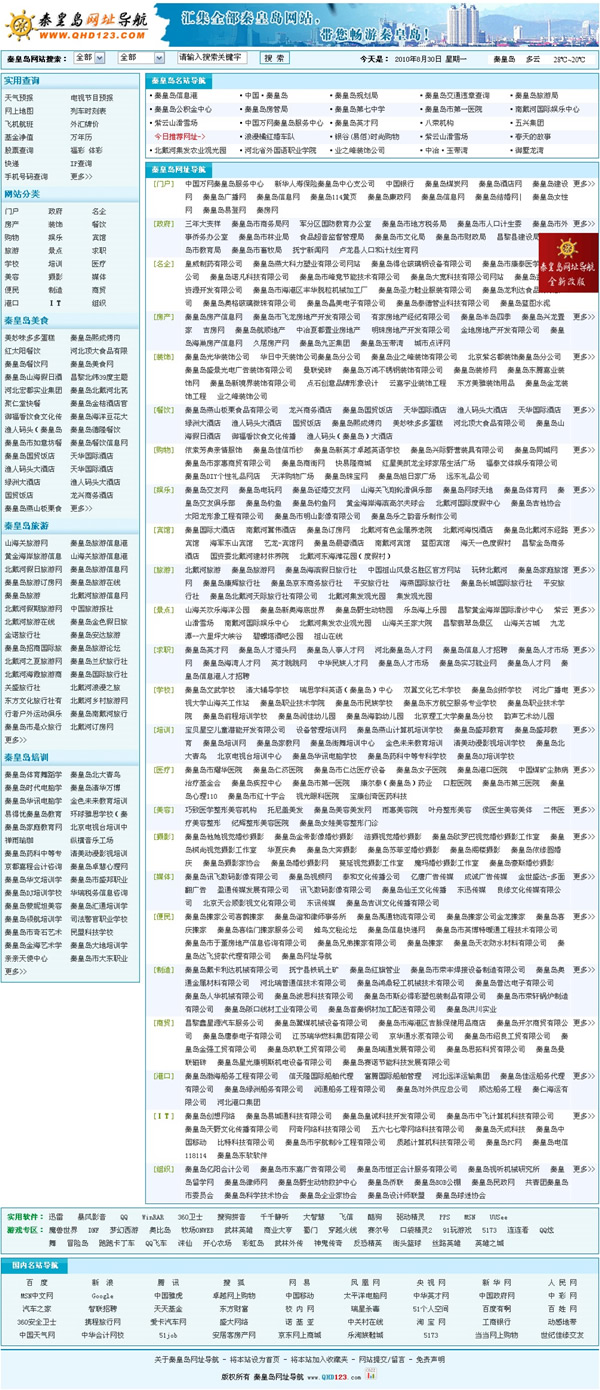 秦皇島網址導航致力于宣傳推廣秦皇島本地的網站,在這里,您可以方便、快速的找到關于秦皇島地區的所有網站。可以說,秦皇島網址導航是您認識、了解秦皇島的窗口。不斷搜集、整理及更新秦皇島地區的相關網址是我們的工作,歡迎您常來秦皇島網址導航做客,使她成為您的知心朋友。