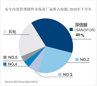 深信服科技在IDC中國發布的2010年下半年中國安全內容管理市場(上網行為管理市場)報告中占有率達到40%,在2009年占有率達到33.8%,蟬聯市場占有率領先。