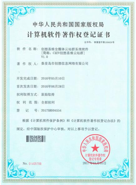 創想易維全媒體云站群系統軟件著作權證書日前正式獲得國家版權局批準,創想公司在云平臺、智慧型、大數據應用的自主產品研發的道路上將奮勇前進,越飛越高。